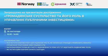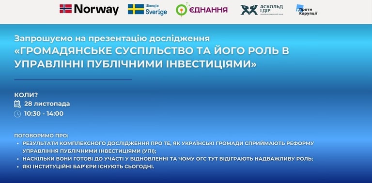 Друзі, раді запросити вас відвідати презентацію дослідження «Громадянське суспільство та його роль в управлінні публічними інвестиціями», де ми поговоримо проважливі питання сьогодення: